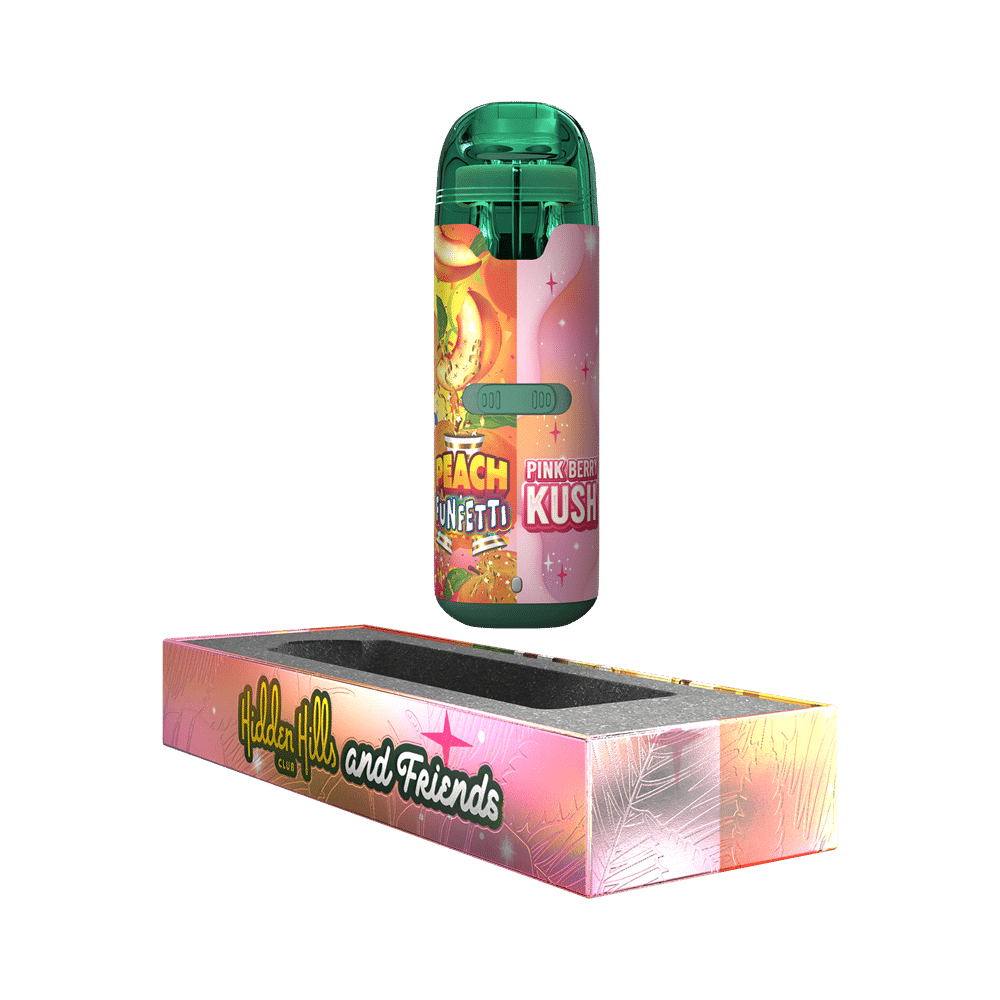 Instead of carrying multiple devices or committing to one strain, this hidden hills disposable vape lets you tailor your session on demand. Start your day with Peach Funfetti’s uplifting energy, then transition into Pink Berry Kush’s calming embrace all from one sleek unit.