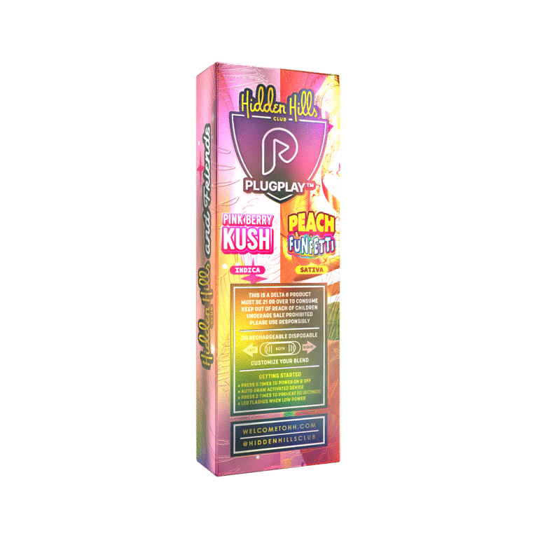 The PLUGPLAY x HIDDEN HILLS Peach Funfetti & Pink Berry Kush Dual Chamber Disposable sets a new benchmark for premium vaping. With dual-strain versatility, powerful cannabinoids, flawless flavor delivery, and rechargeable convenience, it stands at the top of the hidden hills disposable category.